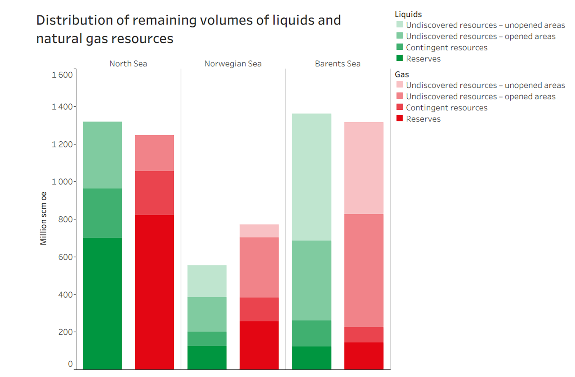 Distribution of remaining liquids resources (green) and gas resources (red) by sea area and resource class (Source: Norwegian Offshore Directorate)
