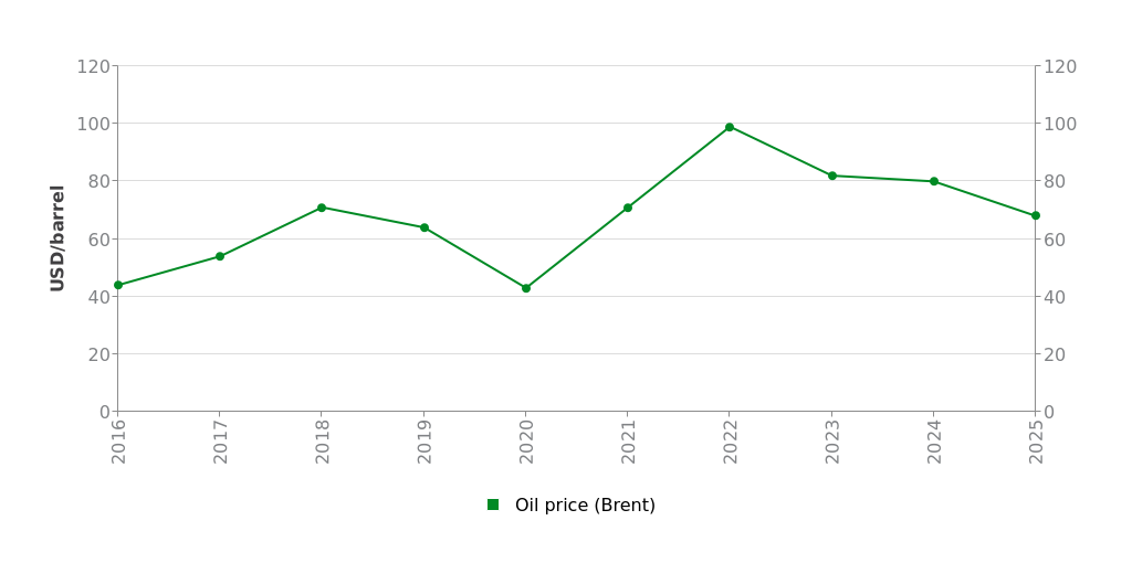Print illustration Download data Oil Price Brent, yearly average 2016-2025 Download PDF Download as image (PNG)