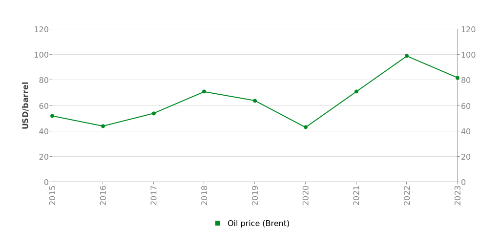 Oil Price Brent, yearly average 2015-2023
