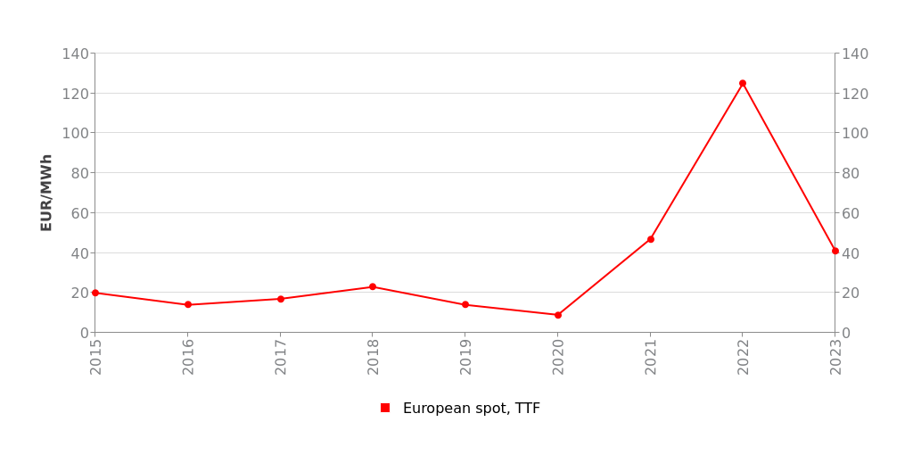 Print illustration Download data European gas price (TTF), yearly average 2015-2023 Download PDF Download as image (PNG)