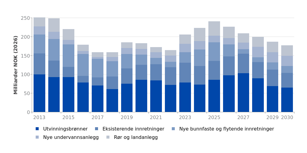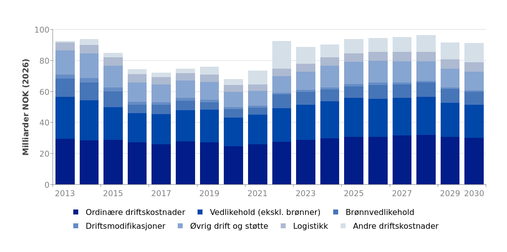 I 2025 var samlede kostnader nærmere 390 milliarder kroner. Av dette bestod rundt 60 prosent av investeringer, 25 prosent driftskostnader, mens letekostnader utgjorde ni prosent. Det forventes en reell reduksjon i samlede kostnader med to prosent i 2026. Frem mot 2030 forventes gradvis fall i investeringsaktiviteten som følge av at flere utbyggingsprosjekter nærmer seg ferdigstillelse. Økningen i totalkostnader frem mot 2025 knytter seg i stor grad til økte investeringer i forbindelse med at det ble tatt investeringsbeslutning for flere prosjekter høsten 2022.