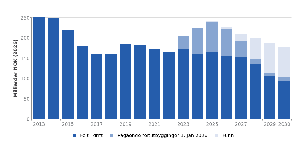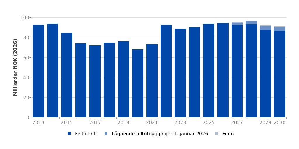 Ved utgangen av 2025 var det 97 felt i produksjon. Samlede driftskostnader utgjorde i 2025 om lag 94 milliarder kroner. Operatørene jobber kontinuerlig med å redusere driftskostnadene, men økte kraftkostnader bidrar til tross for dette til noe økende kostnader.