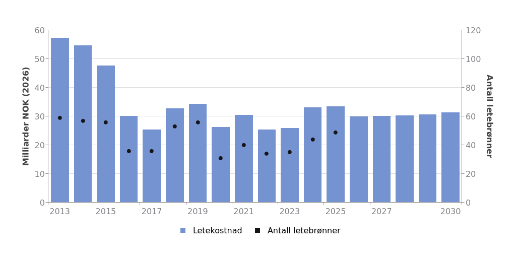 Skriv ut figur Last ned grunnlag Letekostnader og antall letebrønner Last ned PDF Last ned som bilde (PNG)