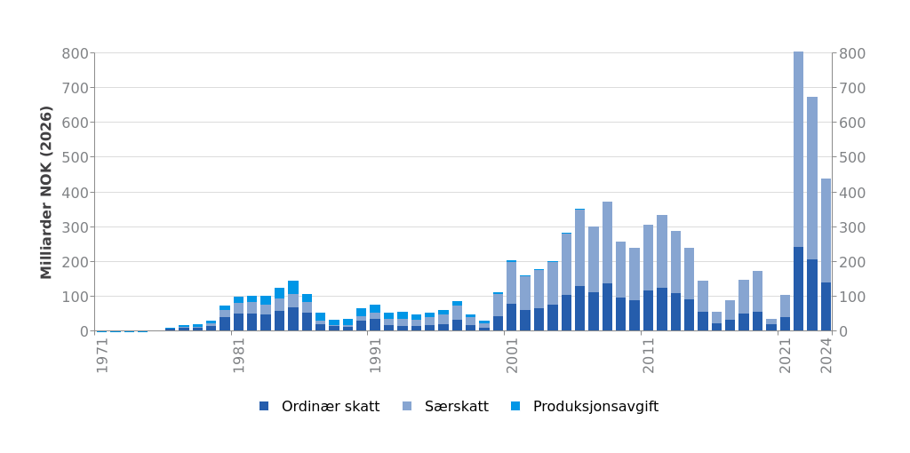 Totale skatteinnbetalinger til staten er anslått til om lag 374 milliarder kroner i 2025. Figuren under viser betalt skatt til staten i perioden 1971 til 2024.