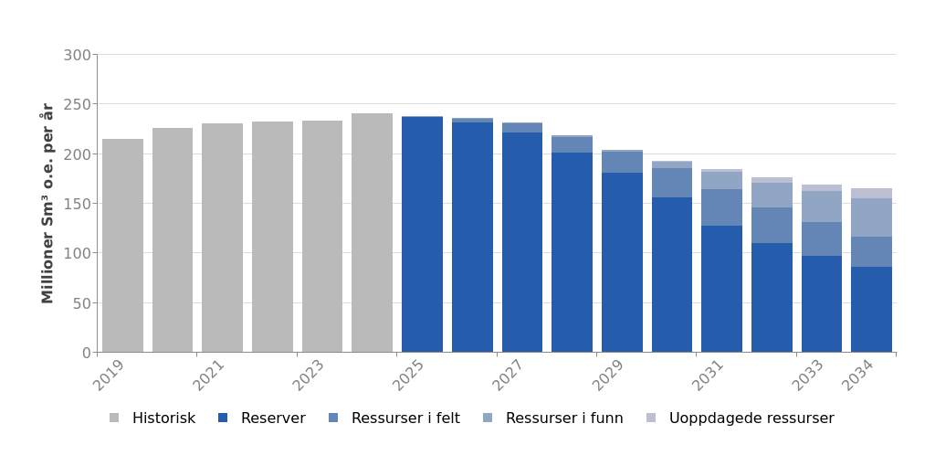 Historisk totalproduksjon og prognose frem til 2034, fordelt på modenhet av ressursene, er vist i figuren under.